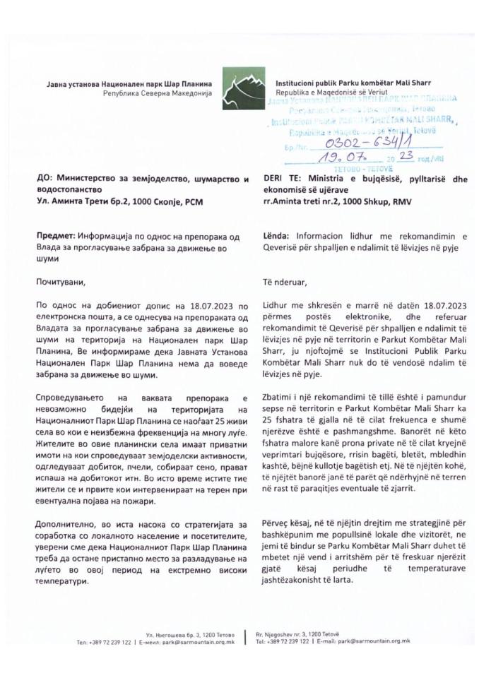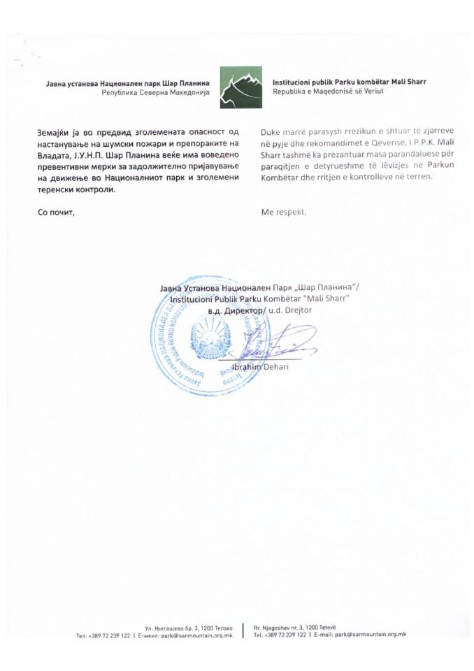 In relation to the Government's recommendation to ban movement in the forests, we inform the public that P.I.N.P Shar Mountain has not introduced a ban on movement in the forest on the territory of the National Park.