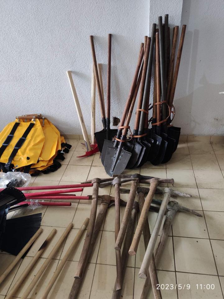 4 моторни пили, 4 секири, 25 напртњачи, 20 лопати, 9 копачи, 10 гребла, 15 метални метлчи и 3 светилки.