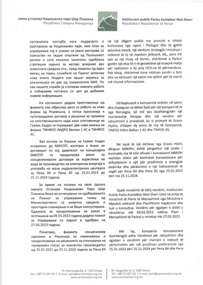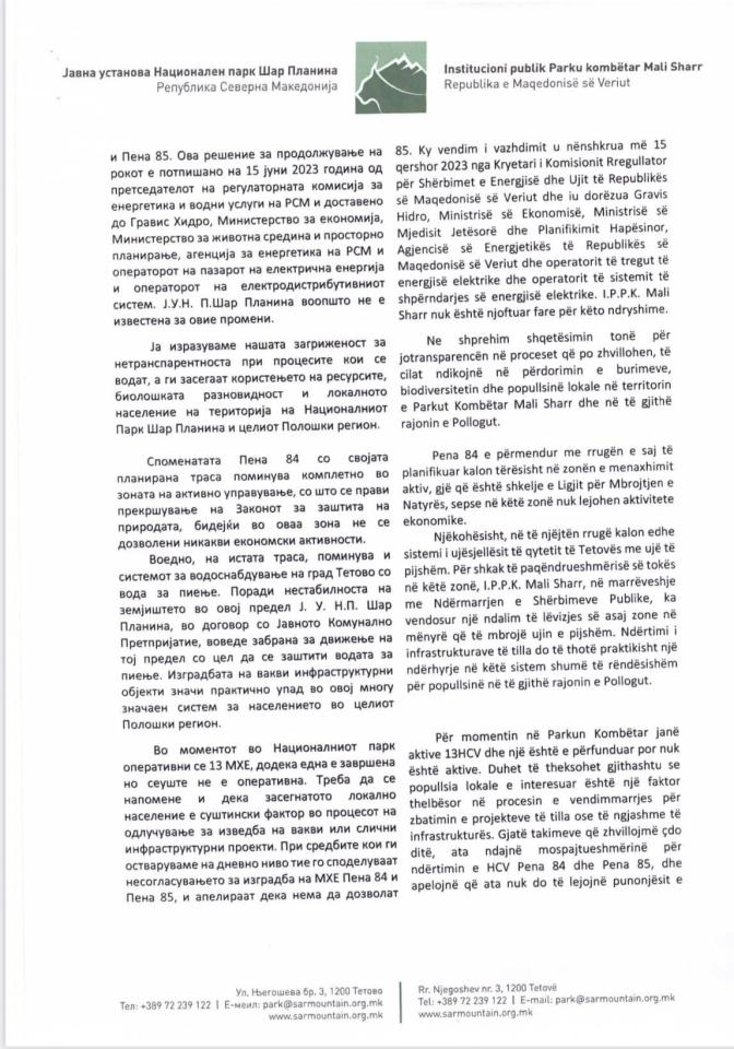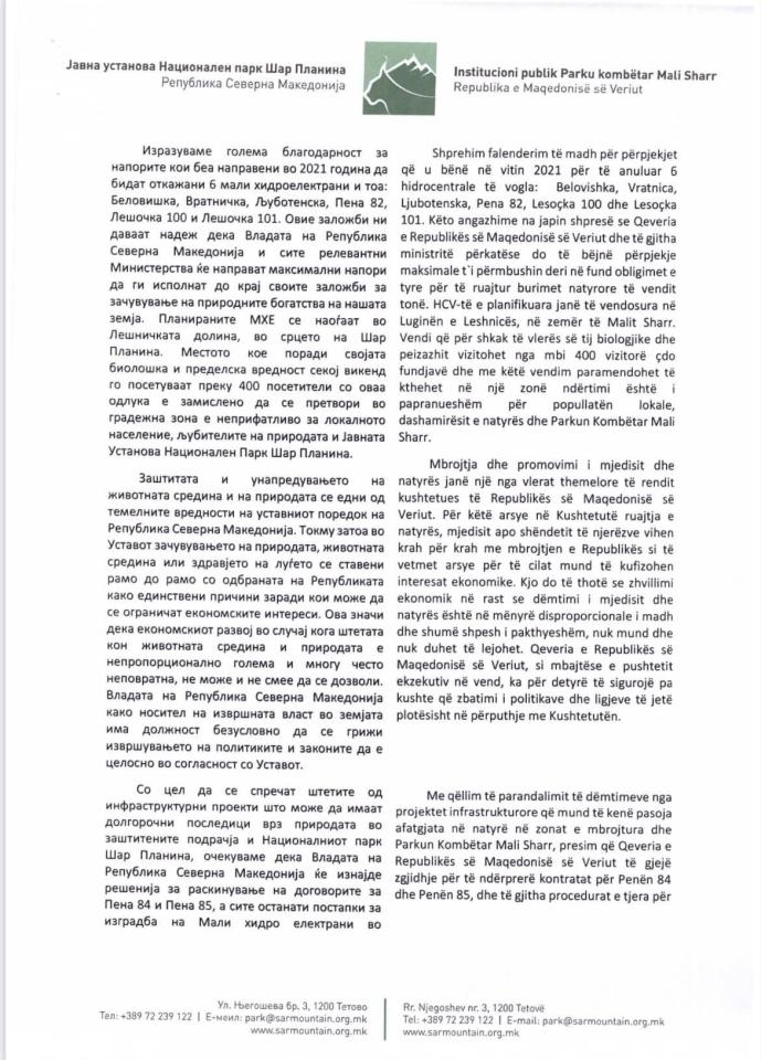 Me qëllim të parandalimit të dëmtimeve nga projektet infrastrukturore që mund të kenë pasoja afatgjata në natyrë në zonat e mbrojtura dhe Parkun Kombëtar Mali Sharr, presim që Qeveria e Republikës së Maqedonisë së Veriut të gjejë zgjidhje për të ndërprerë kontratat për Penën 84 dhe Penën 85, dhe të gjitha procedurat e tjera për ndërtimin e hidrocentraleve të vogla në zonat e mbrojtura do të ndërpriten menjëherë.