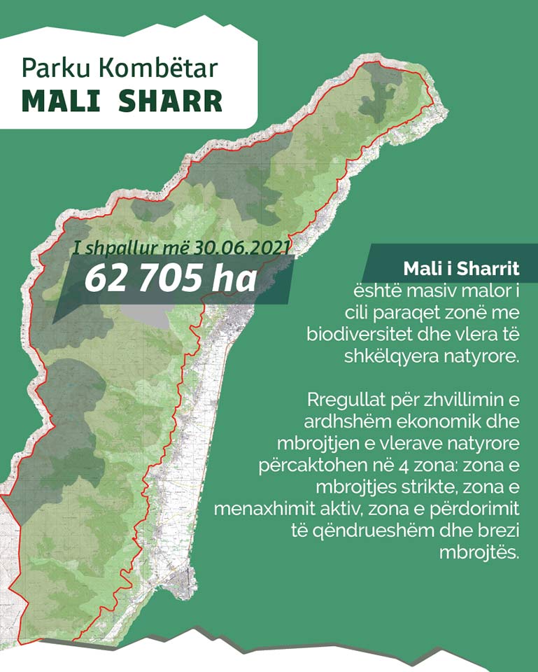20.07.2022 PK i Malit Sharr shtrihet në një sipërfaqe prej 62 705 ha dhe zhvillimi i ardhshëm ekonomik dhe mbrojtja e vlerave natyrore janë përcaktuar në 4 zona mbrojtëse. Galeria